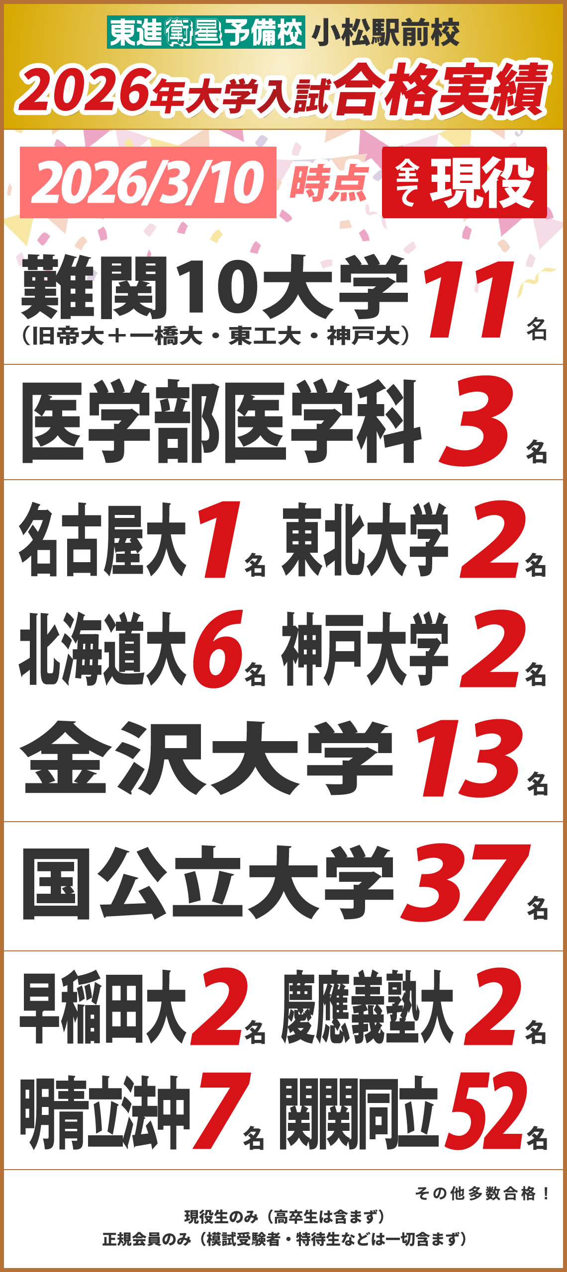 • ・合格実績の確定は3月31日を締め切りとする。4月1日以降に判明した合格者は計上しない。